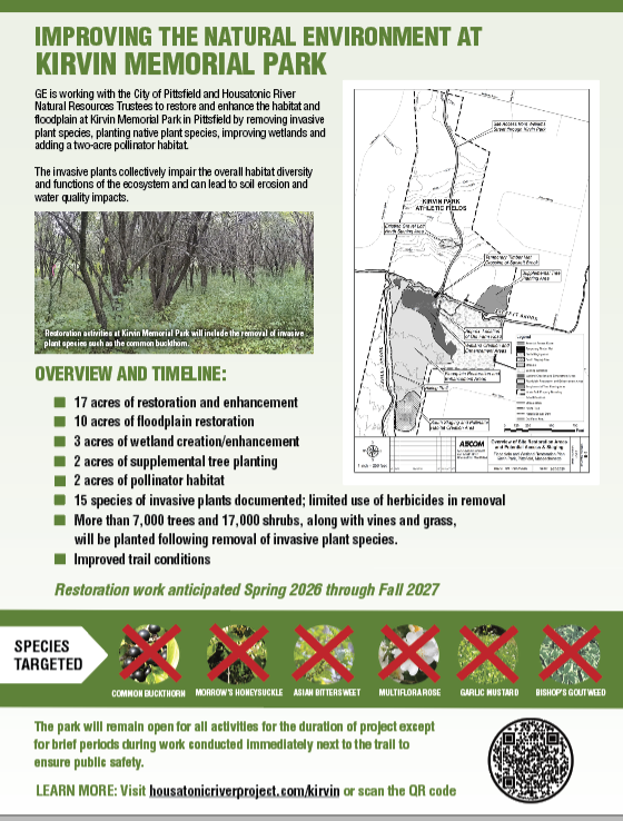 GE is implementing a natural resource restoration project at Kirvin Memorial Park in Pittsfield, in consultation with the City of Pittsfield and the Massachusetts Subcouncil of the Housatonic Natural Resource Trustees (including the Massachusetts Department of Environmental Protection and the U.S Fish & Wildlife Service).